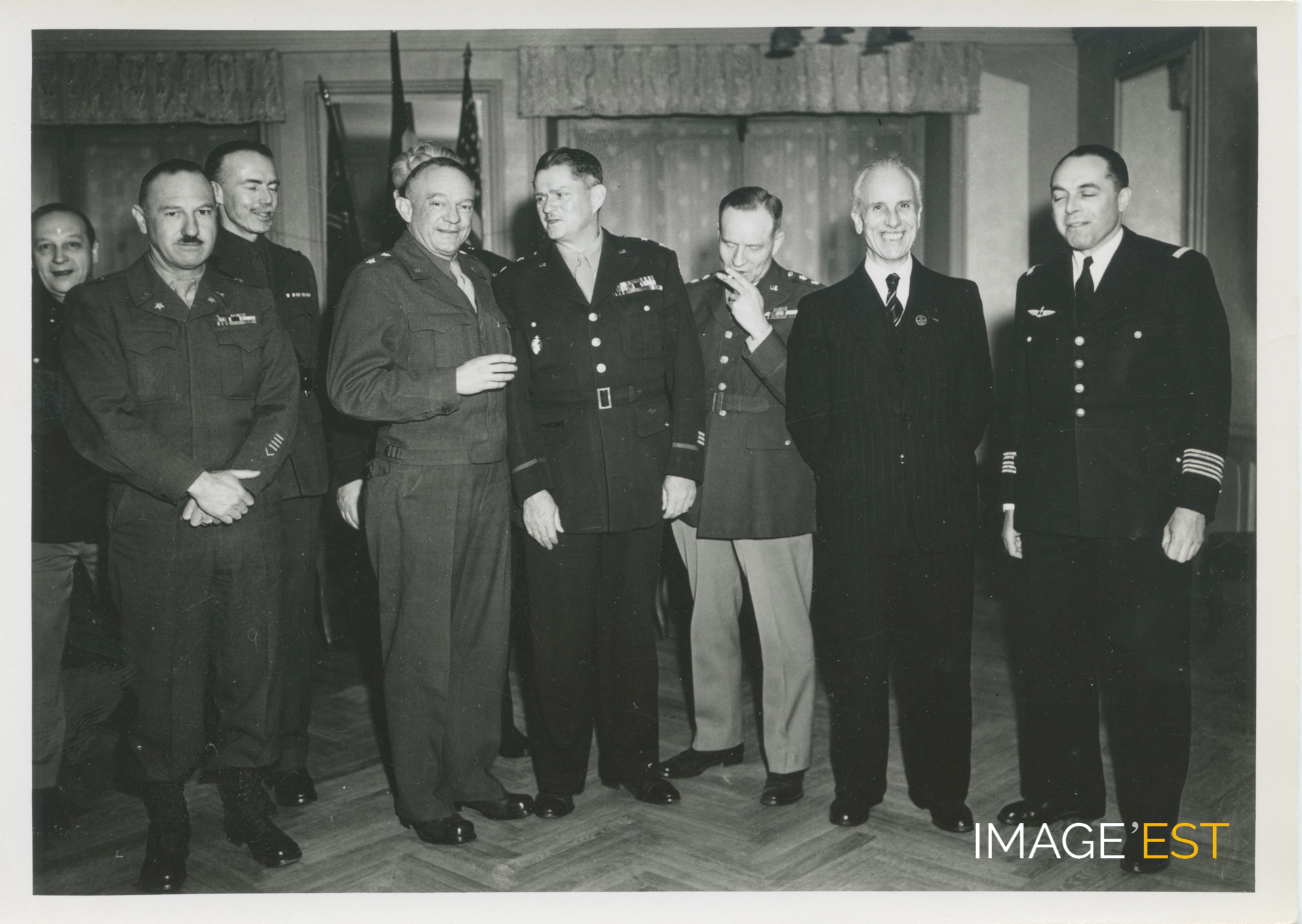 Réception donnée au Palais du Gouvernement à Nancy (Meurthe-et-Moselle). Cette réception solennelle s'inscrit dans le cadre des honneurs militaires reçus par le colonel Grandval en reconnaissance de ses mérites dans la Résistance. De droite à gauche, le colonel Grandval, commandant de la 20e région militaire ; Paul André Chailley-Bert (1890-1973), commissaire de la République ; deux généraux américains non identifiés ; le général Arthur R. Wilson, commandant de la " Continental advance Section ".