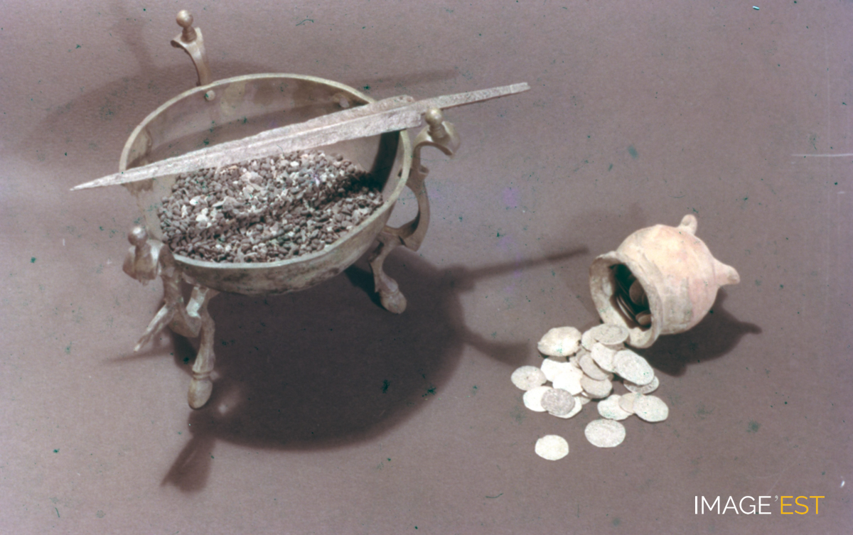 La Lorraine et la guerre de Trente ans. À propos du sac de la ville de Saint-Nicolas-de-Port, Jean Hurstel raconte : " Le petit réchaud de cuivre, emporté avec un poignard par un bourgeois réfugié dans une tour de l'égise, fut retrouvé au siècle dernier, il rappelle par le blé calciné, cet Oradour lorrain de la guerre de Trente ans... Pot de terre renfermant 144 deniers d'argent ... économies qu'un paysan avait confiées à la terre avant de se réfugier dans les bois, à l'approche d'une troupte de pillards..." . En marge de la diapositive figure la mention : " 9. Réchaud de Saint-Nicolas-de-Port et trèsor de paysan (vers 1635) ". Séries de diapositives sélectionnées et commentées par Jean Hurstel, directeur du Service éducatif des Musées de l'Académie de Nancy-Metz.