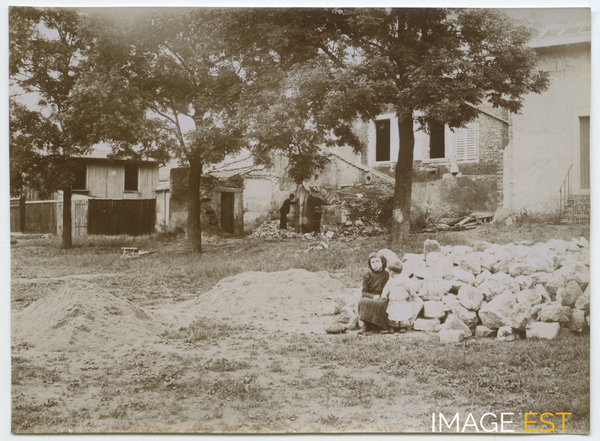 Terre-plein sur l'ancien réduit de La Reine derrière la porte de la Craffe à Nancy (Meurthe-et-Moselle), le 23 juin 1899. Une mention manuscrite au verso de cette photographie précise : " 315 - 23 juin 1899 - Le terre-plein du réduit - (Le petit personnage au fond regarde le débouché d'un escalier qui descendait sous la voûte - 16 - 2 ". À l'arrière-plan, présence d'un homme près d'une voûte et d'enfants au premier plan près de gravats.