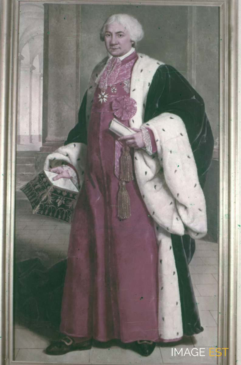 La Lorraine sous le Consulat et le Ier Empire. Portrait de Régnier, ministre de la Justice de 1802 à 1813. En marge de la diapositive figure la mention : " 4. Portrait de Régnier, ministre de la Justice (1802-1813) ". Séries de diapositives sélectionnées et commentées par Jean Hurstel, directeur du Service éducatif des Musées de l'Académie de Nancy-Metz.