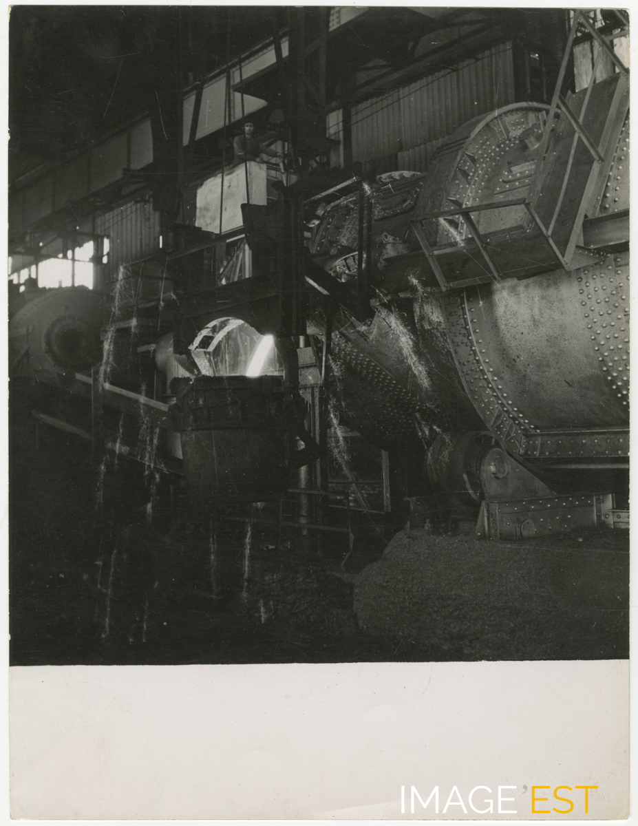 Mélangeur de l'usine de la " Société des hauts-fourneaux et fonderies de Pont-à-Mousson " à Pont-à-Mousson (Meurthe et Moselle) et remplissage d'une poche à fonte. Au verso figurent la note manuscrite " Pont à Mousson - M.& M - Hauts fourneaux " et le cachet du photographe " Photo Goldner 4, square Claude Debussy, 4 Paris - 17e - nouvelle adresse 49, rue des Mathurins, Paris - 8e ".