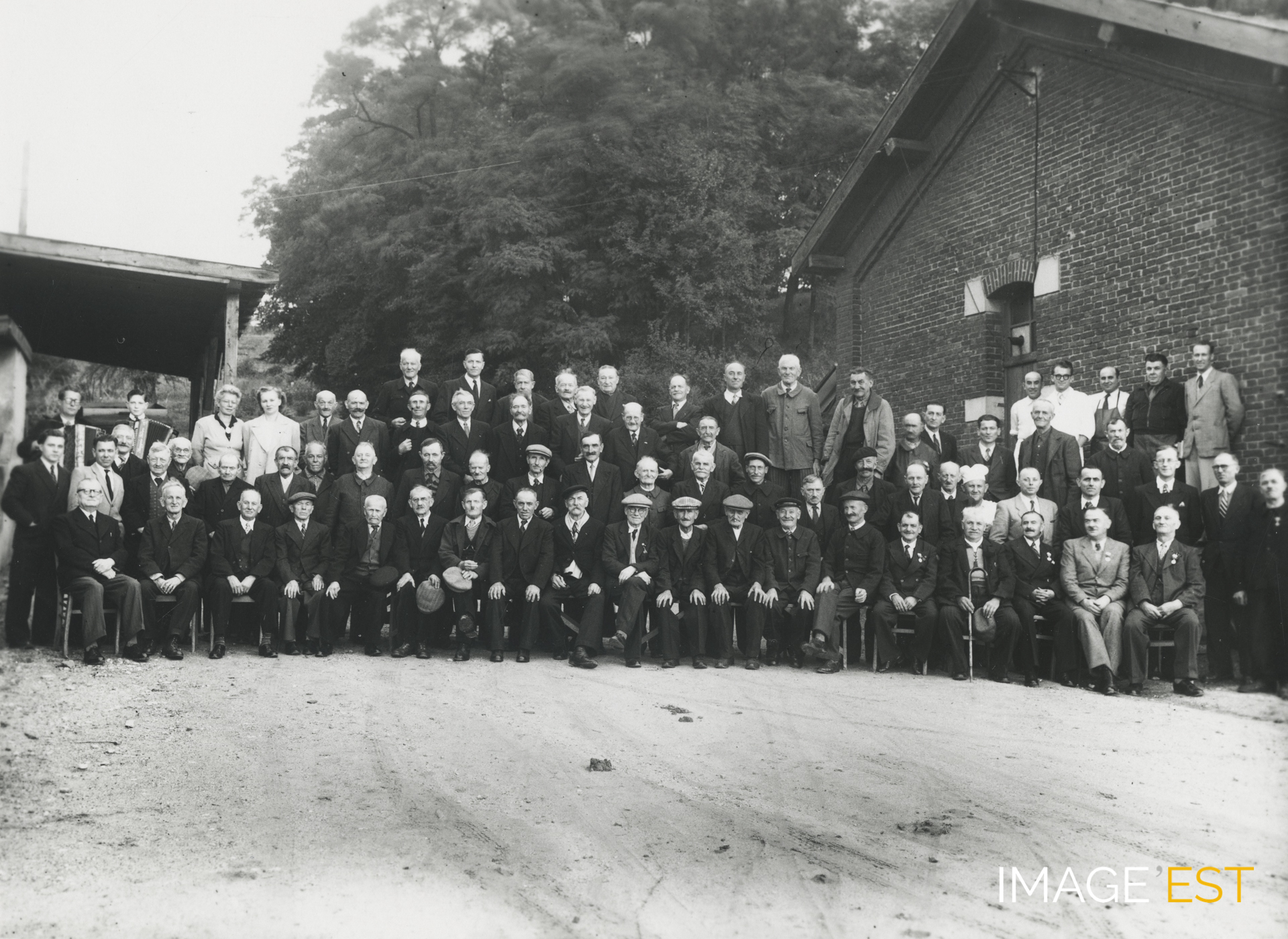 Repas des Anciens de Varan, ouvriers des Soudières Réunies La Madeleine-Varangéville à Varangéville (Meurthe-et-Moselle) le 23 septembre 1950.