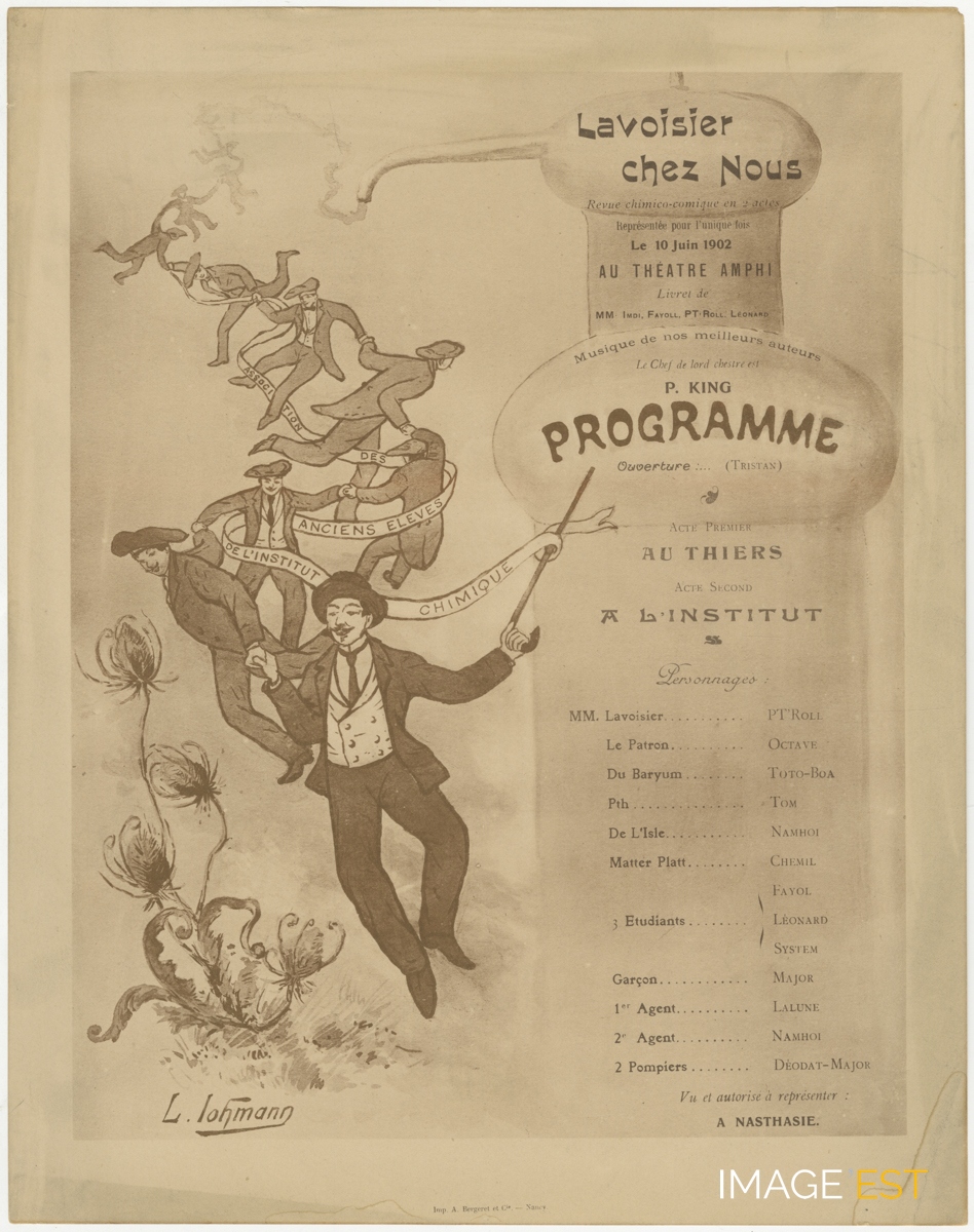 Programme d'une revue théâtrale de l'Associaiton des anciens élèves de l'Institut chimique de Nancy le 10 juin 1902 à Nancy (Meurthe-et-Moselle). Le premier acte s'est déroulé au " Thiers " et le second, à l'Institut.