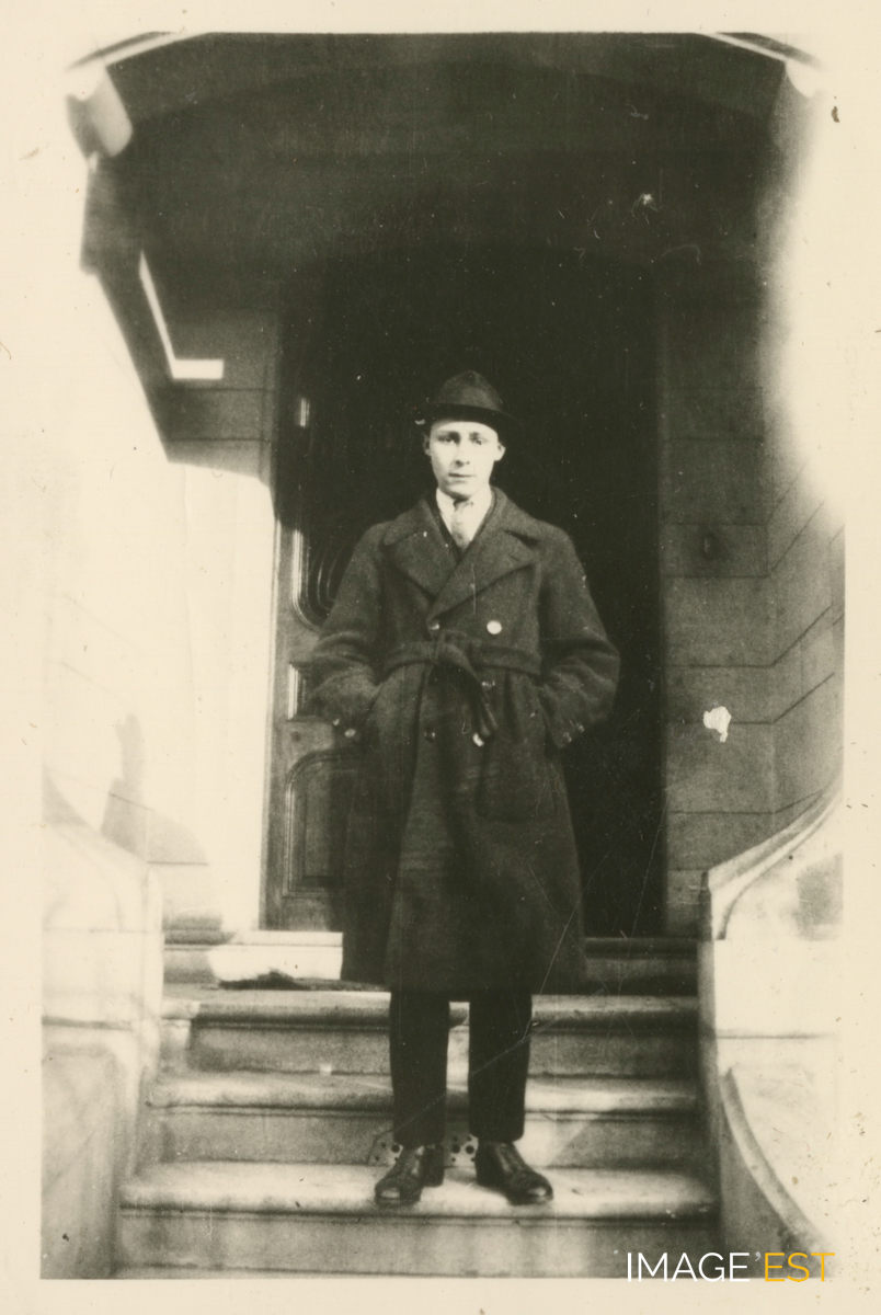 Robert (1902-1960), fils de Charles et Berthe Kalis, ténor du barreau de Nancy, sur le perron de la demeure familiale au 5, avenue Georges Clemenceau à Nancy (Meurthe-et-Moselle), construite en 1911 par Fernand César (1879-1969) architecte DPLG de l'École de Nancy. (Source : Archives privées des familles Kalis-Moreau).