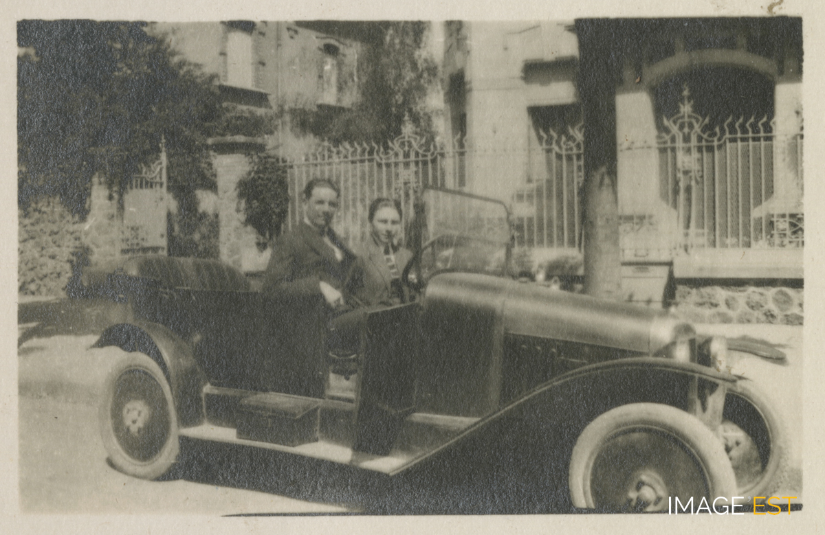 Robert (1902-1960), fils de Charles et Berthe Kalis, ténor du barreau de Nancy, au volant d'une automobile devant la demeure familiale, construite en 1911 par Fernand César (1879-1969), architecte DPLG de l'École de Nancy au 5, avenue Georges Clemenceau à Nancy (Meurthe-et-Moselle). (Source : Archives privées des familles Kalis-Moreau).