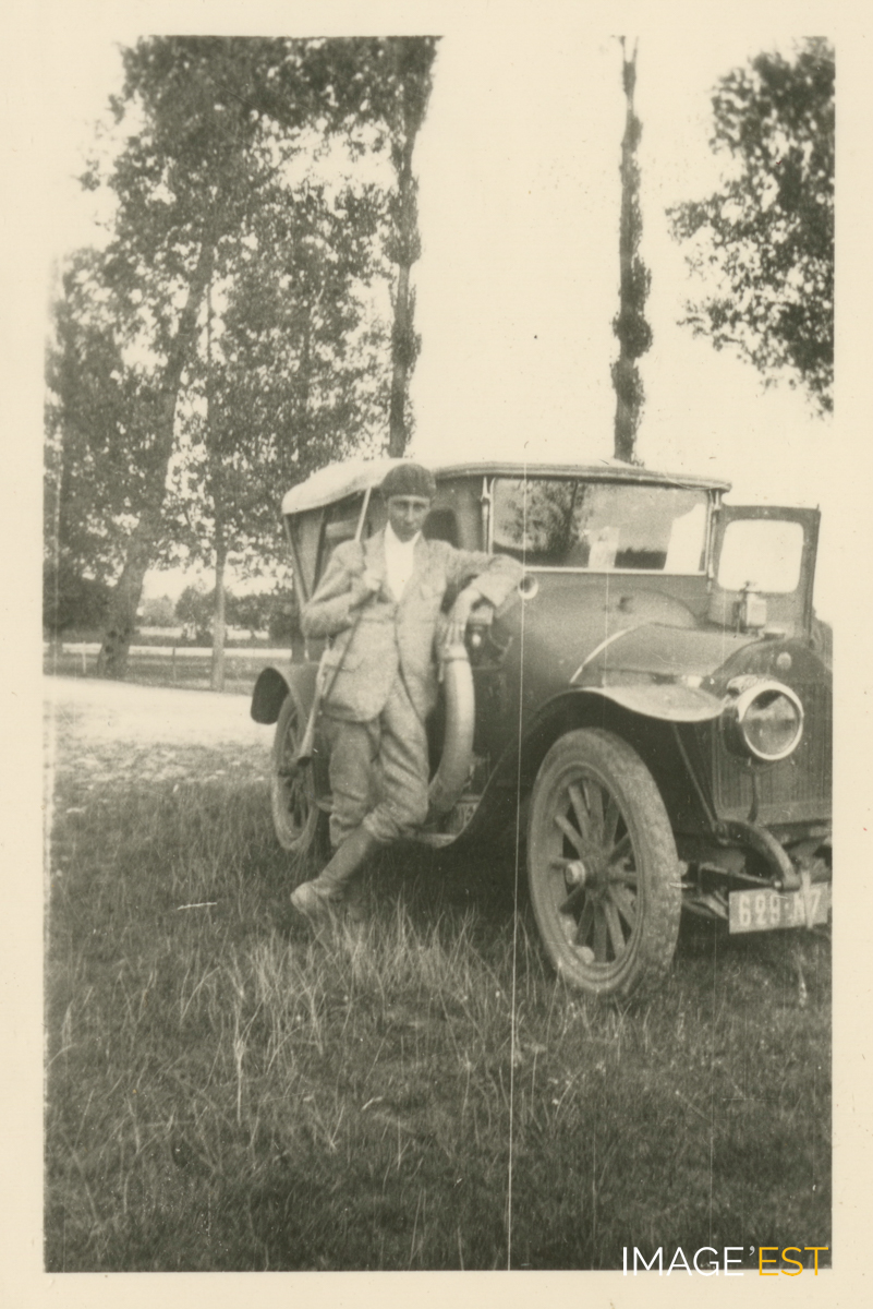 Robert (1902-1960), fils de Charles et Berthe Kalis, ténor du barreau de Nancy, devant une automobile, fusil à l'épaule. (Source : Archives privées des familles Kalis-Moreau).