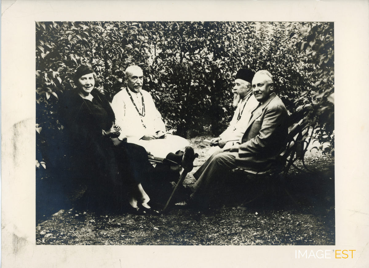 Monsieur Robert Petit, directeur du Service exportations de la société Pont-à-Mousson, et son épouse (grand-parents de Francine Ricci) recevant une délégation étrangère dans leur jardin à Maxéville (Meurthe-et-Moselle).