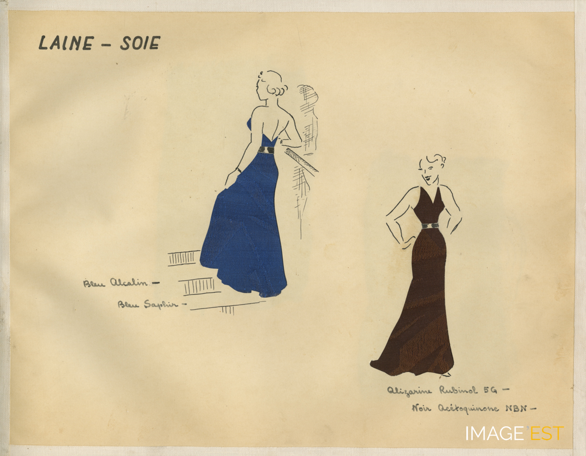 Robes de soirée en " Laine - soie ". Cette planche est extraite de l'album intitulé " Teintures - Impressions, J. S. Dahl ", issu des collections de l'École nationale supérieure des industries chimiques (ENSIC) à Nancy (Meurthe-et-Moselle). L'accent est porté sur deux couleurs " Bleu alcalin - bleu saphir ; Alizarine rubinol 5G noir Acétoquinone NBN" qui ressortent des deux vêtements féminins. La composition repose sur une page cartonnée épaisse où ont été découpées les silhouettes des costumes sur deux morceaux de soie contrecollés.