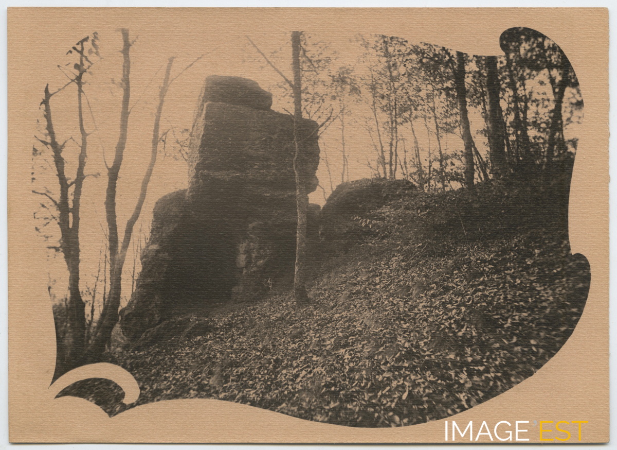 Rochers probablement dans le département des Vosges. Cette photographie est extraite d'un album en cuir repoussé comprenant un ensemble de 48 photographies (format 13 x 18 cm), noir et blanc, illustrant les loisirs et la vie d'une famille aisée probablement dans le département des Vosges à la fin du XIXe ou au début du XXe siècle.