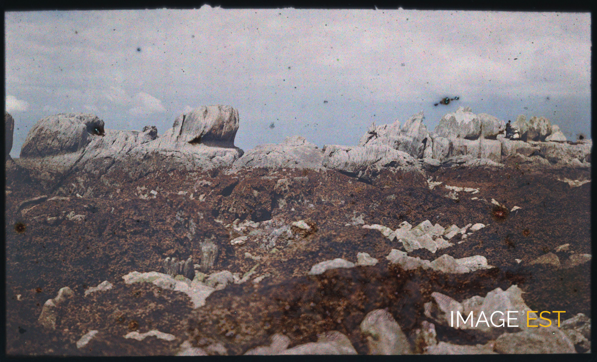 Ensemble de rochers probablement en bordure de mer en Bretagne. Aucune mention manuscrite en marge de la plaque de verre autochrome.