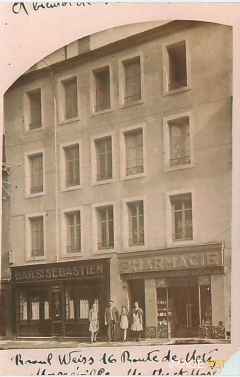 Façades du bar Saint-Sébastien et de la pharmacie Weiss, 16 route de Metz, ancien quartier Saint-Sébastien, à Maxéville (Meurthe-et-Moselle).