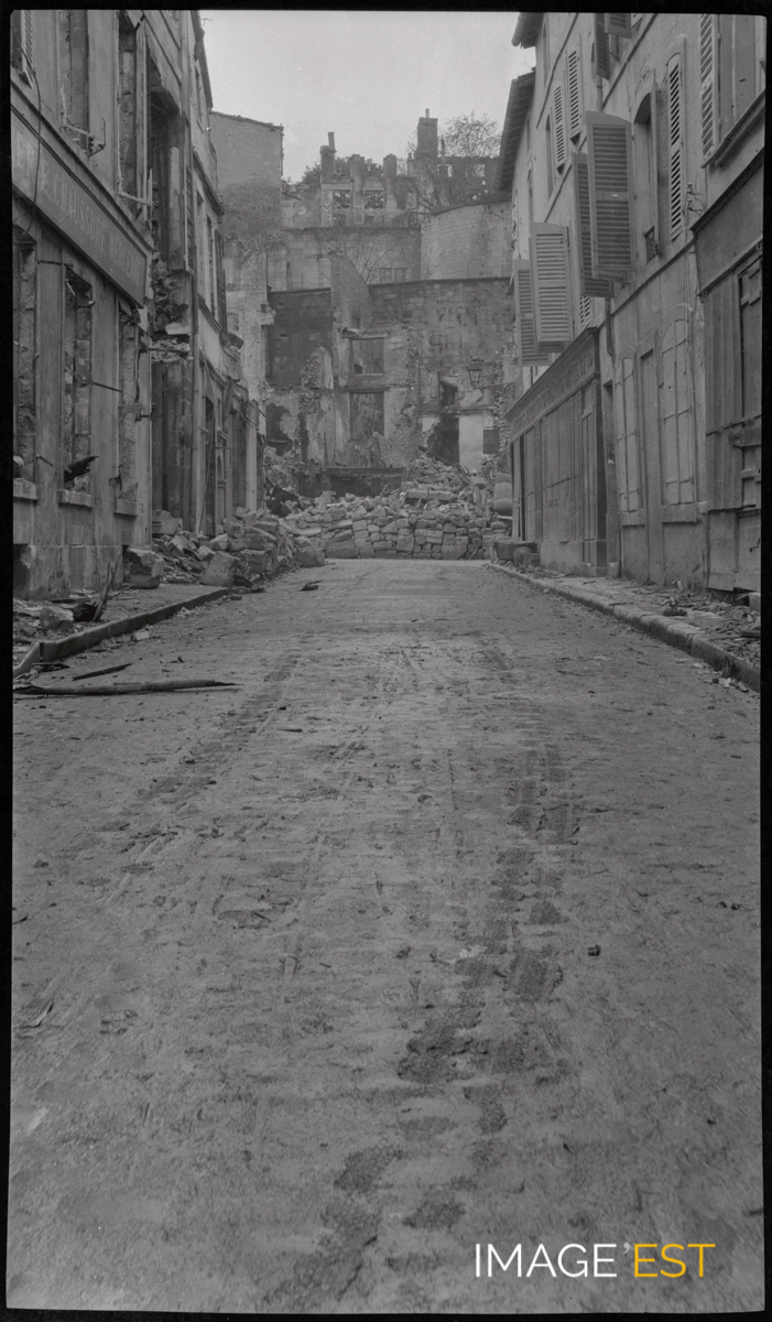 Rue commerçante en ruine probablement située à proximité de Verdun (Meuse) après la Première Guerre mondiale. Le cliché provient d'une enveloppe sur laquelle figure la mention manuscrite : " Villages ".