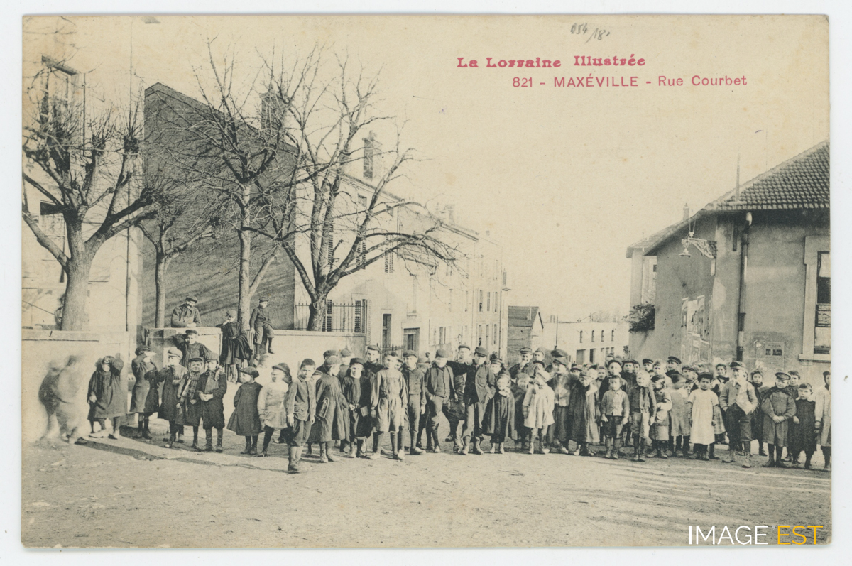 Groupement d'élèves de l'école, située à droite, attroupés en haut de la rue Courbet à Maxéville (Meurthe-et-Moselle) au niveau du croisement avec l'ancienne rue de la Mairie.