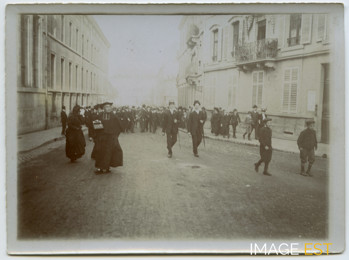 Cortège composé d'une foule précédant le frère Athanase-Émile des Écoles chrétiennes lors de son expulsion, rue de Serre à Nancy (Meurthe-et-Moselle), le 18 août 1908. Une mention manuscrite au verso de cette photographie précise : " J.Z. N° 1065 - 18 8 1908 - Départ du frère Athanase des Écoles chrétiennes expulsé par la canaillarchie - (a) Tête du cortège, rue de Serre - l'abbé Hans cherchant un poste. - Temps de faible soleil embrumé 3h 1/4 - 1D - I/35 - Nancy - E ". Le frère Athanase-Émile, né en 1880 et dont le nom était Louis-Arthur Ritiman ou Ritimann, a été le 20è frère des Écoles chrétiennes et supérieur de cet institut entre 1946 et 1952.