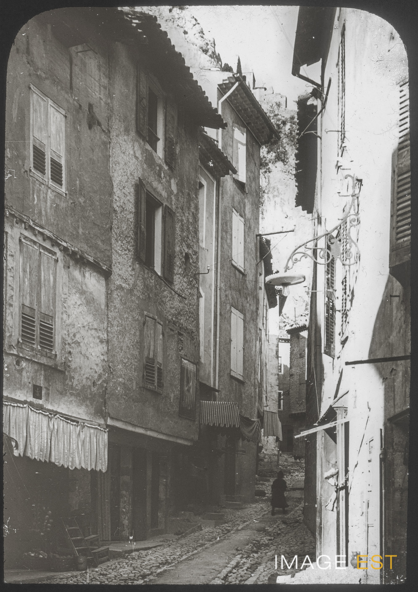 Ruelle de Moustiers-Sainte-Marie (Alpes-de-Haute-Provence). Une mention manuscrite en marge de la plaque de verre indique : " Moustiers. Une rue montante. "