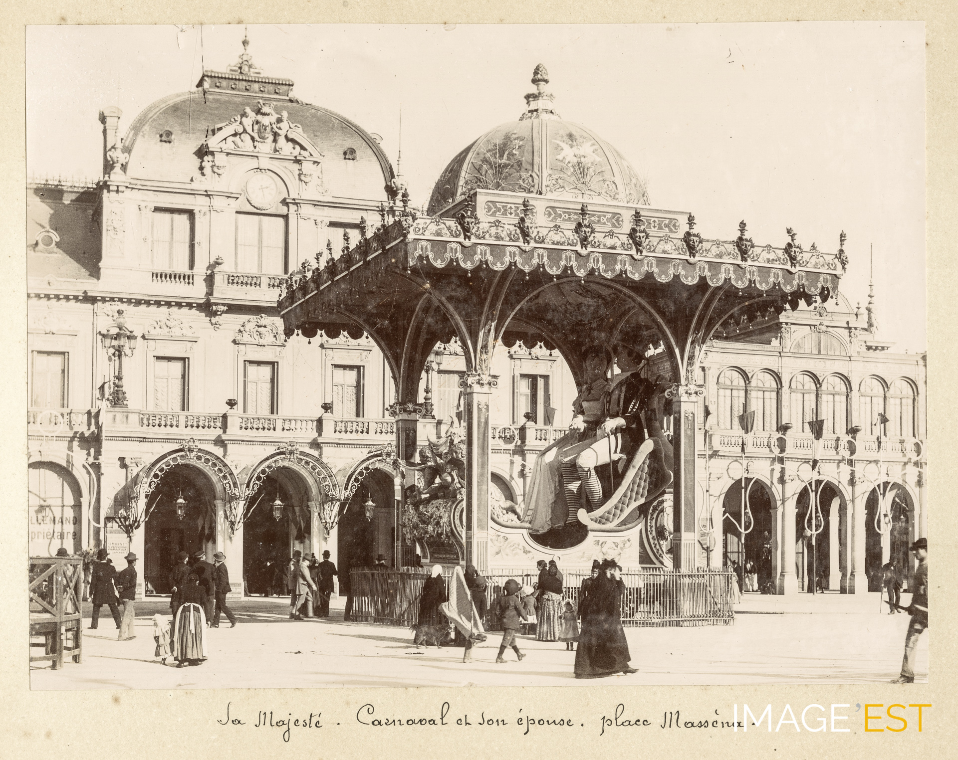 Char de Sa Majesté, Carnaval et son épouse, place Masséna à Nice (Alpes-Maritimes). En 1893, le thème de Carnaval portait sur les Noces de Carnaval et Madame. Cette photographie est extraite d'un album photographique intitulé, " Nice & ses environs J. D. 1893 " comprenant 81 photographies contrecollées sur carton, prises par le lieutenant-colonel Joseph Jules Delarue (1839-1925), commandant le 50e régiment territorial d'infanterie de Nancy, photographe amateur et membre actif de la prestigieuse Société Lorraine de Photographie (fondée à Nancy en 1894) à laquelle il adhère en 1895 (Bulletin de la Société Lorraine de Photographie, n°3 septembre 1895).