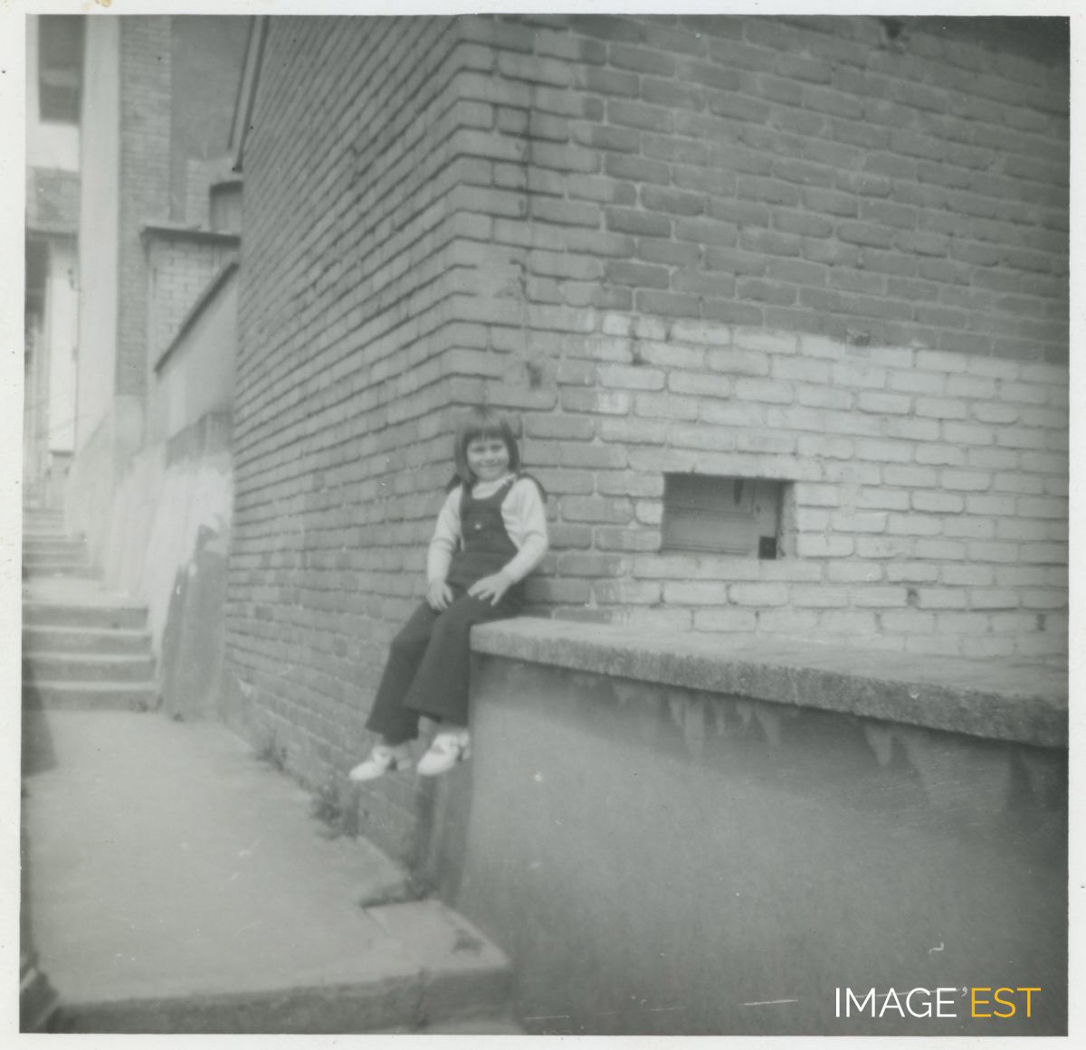 Sabine Vogt assise sur le mur de la " ruelle aux escaliers " à Maxéville (Meurthe-et-Moselle).