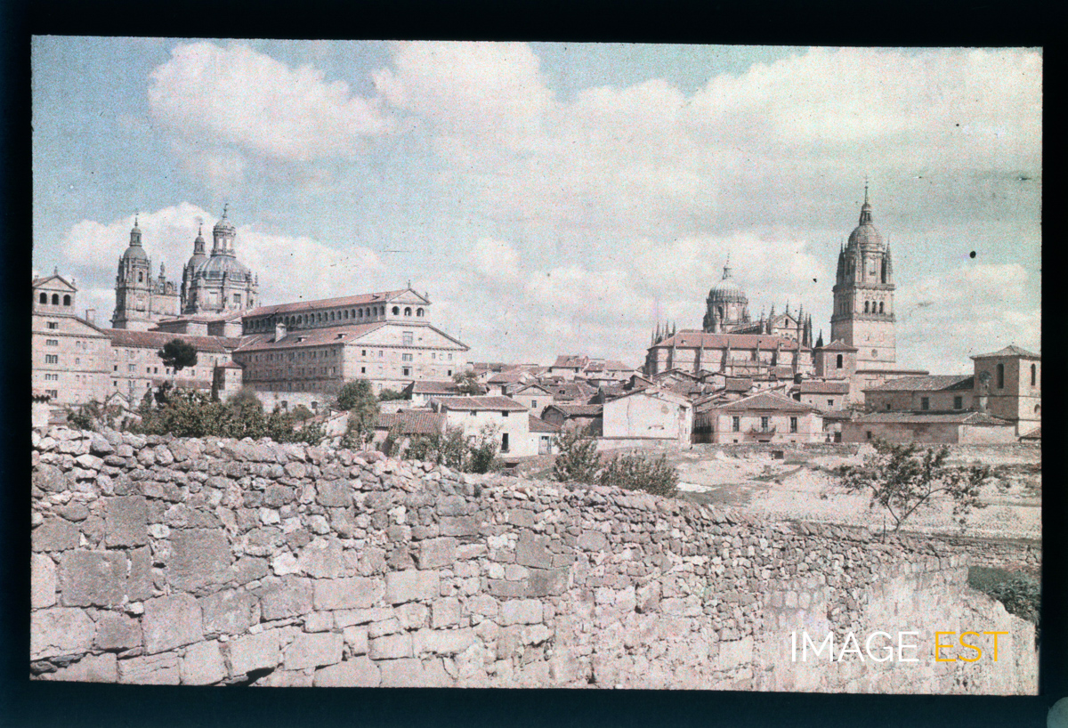 Vue partielle sur Salamanque (Castille-et-León) en Espagne avec sa cathédrale à droite, et l'Université à gauche au second plan. Aucune mention manuscrite en marge de la plaque de verre autochrome.