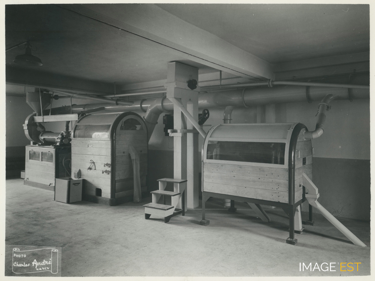Salle de concassage de l'École nationale supérieure des industries chimiques (ENSIC) à Nancy (Meurthe-et-Moselle). Cachet du photographe " Charles André Nancy ". Une mention manuscrite au verso précise : " Salle de concassage ". Cachet de l' " Université de Nancy - Faculté des Sciences - École de Brasserie ".