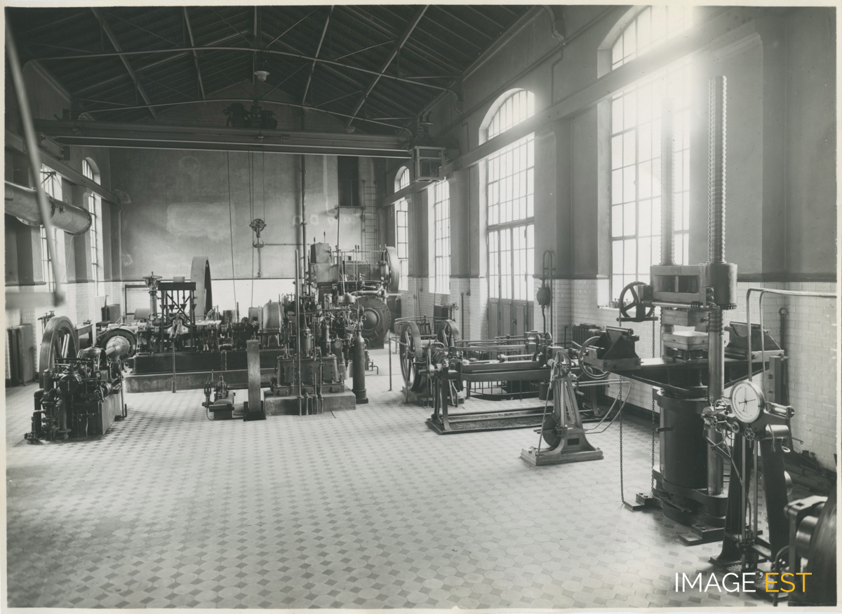 Salle de machines probablement à l'École Nationale Supérieure d'Électricité et de Mécanique (ENSEM) à Nancy (Meurthe-et-Moselle). Une mention manuscrite au verso précise : " Atelier ? ENSEM ? ".