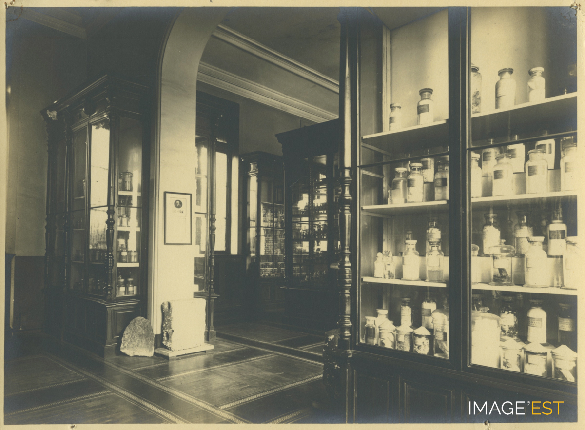 Salle des collections de l'École nationale supérieure des industries chimiques (ENSIC) à Nancy (Meurthe-et-Moselle). Une mention manuscrite au verso précise : " 4. Salle des collections ". Cachet du photographe nancéien Jean Scherbeck au verso.