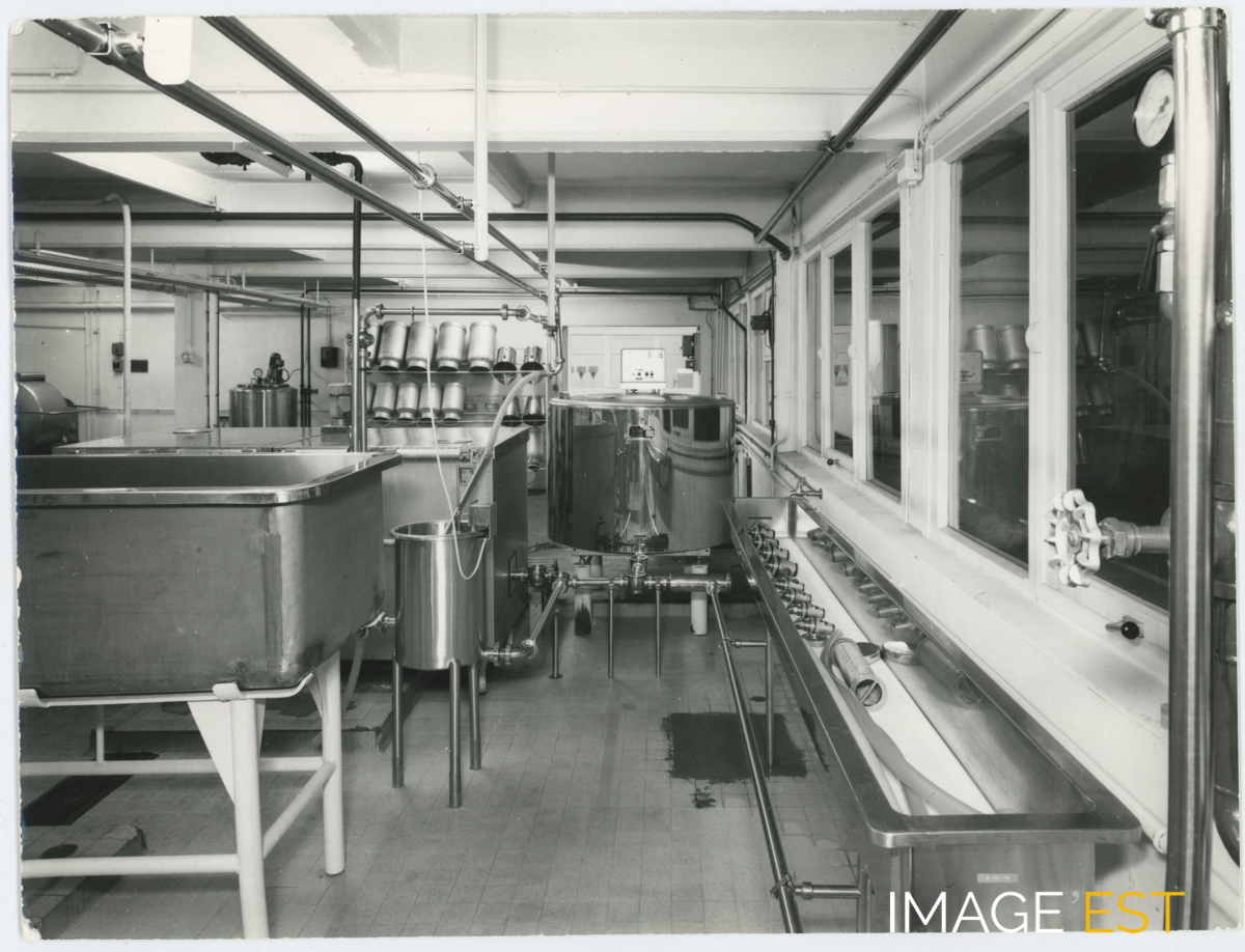 Salle des cuves de l'Ensaia (École nationale supérieure d'agronomie et des industries alimentaires) rue Sainte-Catherine à Nancy (Meurthe-et-Moselle). L'histoire de cette institution remonte à la création successive de trois grandes écoles, l'École de brasserie et de malterie de Nancy (1893), l'Institut colonial et agricole de Nancy (1901) et l'École de laiterie de Nancy (1905). En 1948, l'Institut colonial et agricole de Nancy devient l'École nationale supérieure d'agronomie de Nancy (ENSA). En 1971, les trois grandes écoles (École de brasserie, École de laiterie et Ensa) fusionnent et donnent naissance à l'Ensaia. C'est en 1984 que l'Ensaia quitte ses locaux de la rue Sainte-Catherine à Nancy pour s'installer sur le plateau de Brabois (Source : https://ensaia.univ-lorraine.fr/fr/content/histoire-ensaia). Au verso de ce tirage figure le cachet du photographe nancéien Charles André (n°12 - 5841).