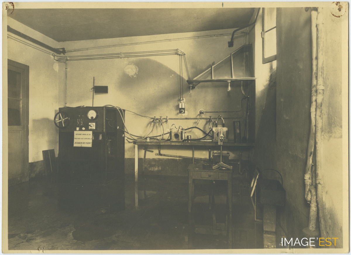 Salle du four à induction de l'Institut chimique de Nancy (ICN) à Nancy (Meurthe-et-Moselle). Une mention manuscrite au verso précise : " Salle du four à induction - Sous-sol rue Sellier ". Cachet " Scherbeck Nancy " au verso.
