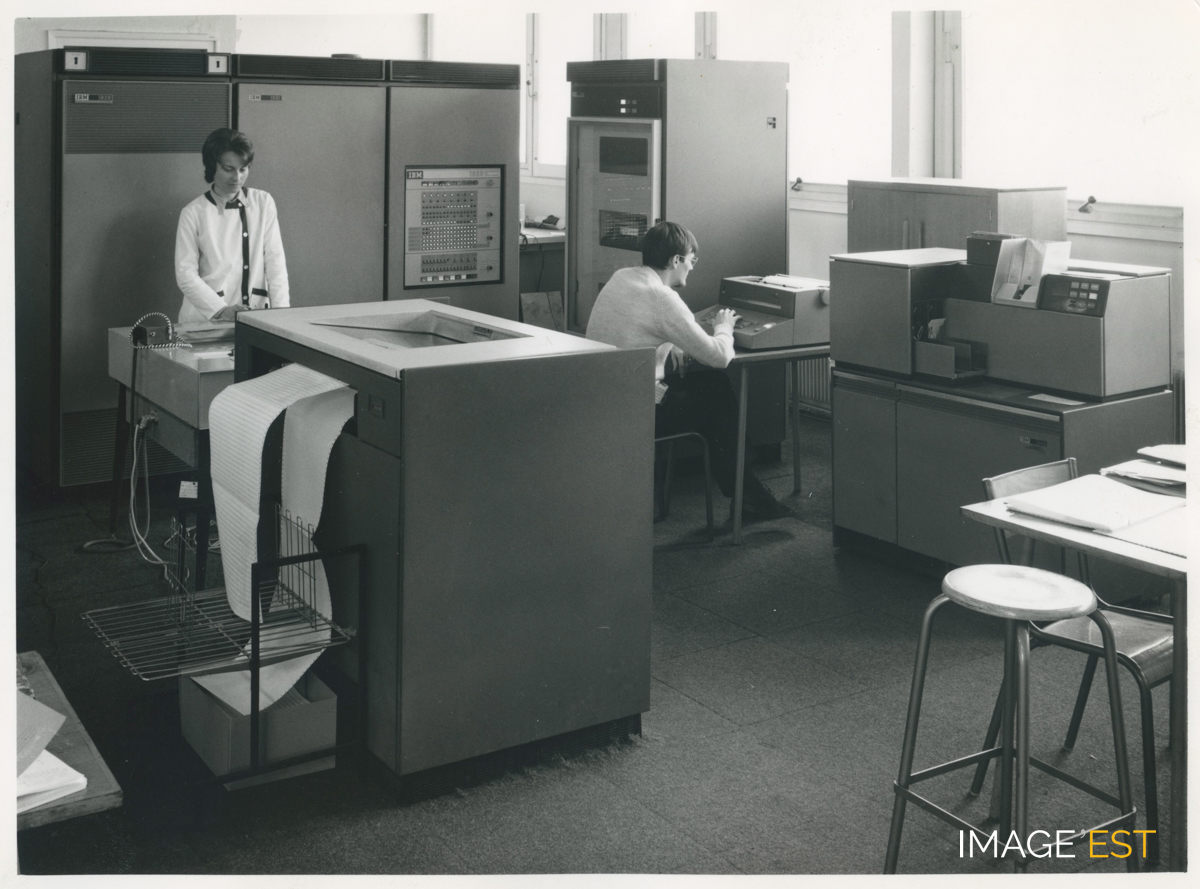 Salle informatique de l'École nationale supérieure des industries chimiques (ENSIC) à Nancy (Meurthe-et-Moselle). Cachet du photographe " Charles André Nancy n° 19- 5689 ". Une mention manuscrite au verso précise : " A. Lemaitre - Salle de l'ordinateur ".