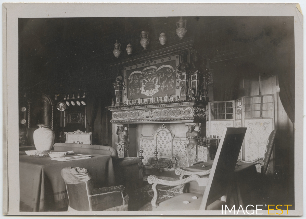 Salon d'un château probablement dans un village du département des Vosges. À remarquer les cariatides de la cheminée richement décorée au-dessus de laquelle se lit la devise de la maison de Bauffremont, " Dieu aide au premier chrétien ". Ancienne famille de noblesse féodale, originaire de Lorraine, la maison de Bauffremont possédait des terres près de Neufchâteau (Vosges). Cette photographie est extraite d'un album en cuir repoussé comprenant un ensemble de 48 photographies (format 13 x 18 cm), noir et blanc, illustrant les loisirs et la vie d'une famille aisée probablement dans le département des Vosges à la fin du XIXe ou au début du XXe siècle.