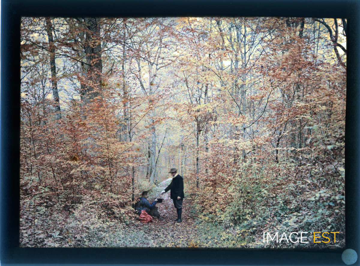Scène de mendicité en forêt probablement en Meurthe-et-Moselle. Un homme assis tend un chapeau à une autre personne qui lui donne une pièce. Aucune mention manuscrite en marge de la plaque de verre autochrome.