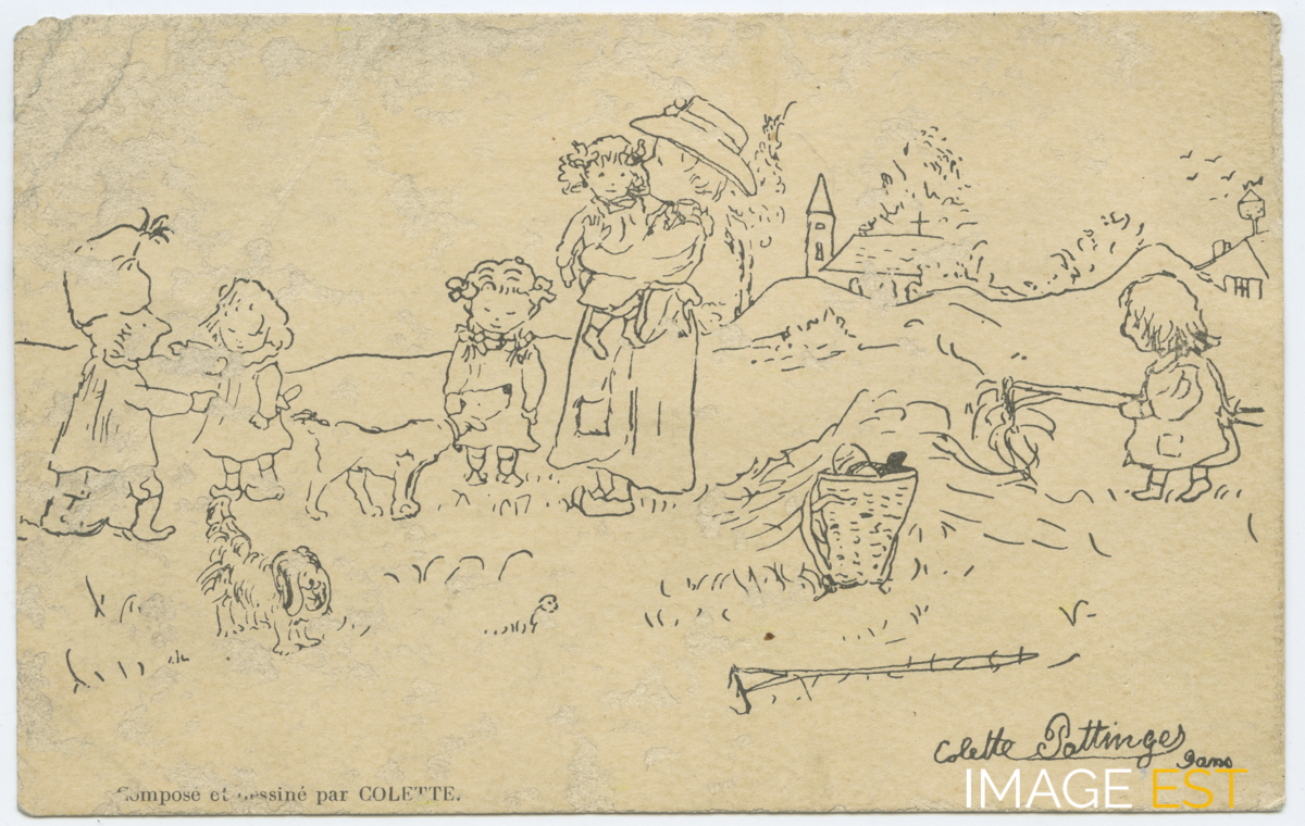 Reproduction en carte postale d'un dessin signé et réalisé par l'illustratrice Colette Pattinger (1896-1940?), représentant une maman et ses enfants dans un champ. L'un des enfants retourne la terre à l'aide d'une bèche. Sur la carte, figure la signature manuscrite : " Colette Pattinger 9 ans " ainsi que l'inscription " Composé et dessiné par COLETTE ".