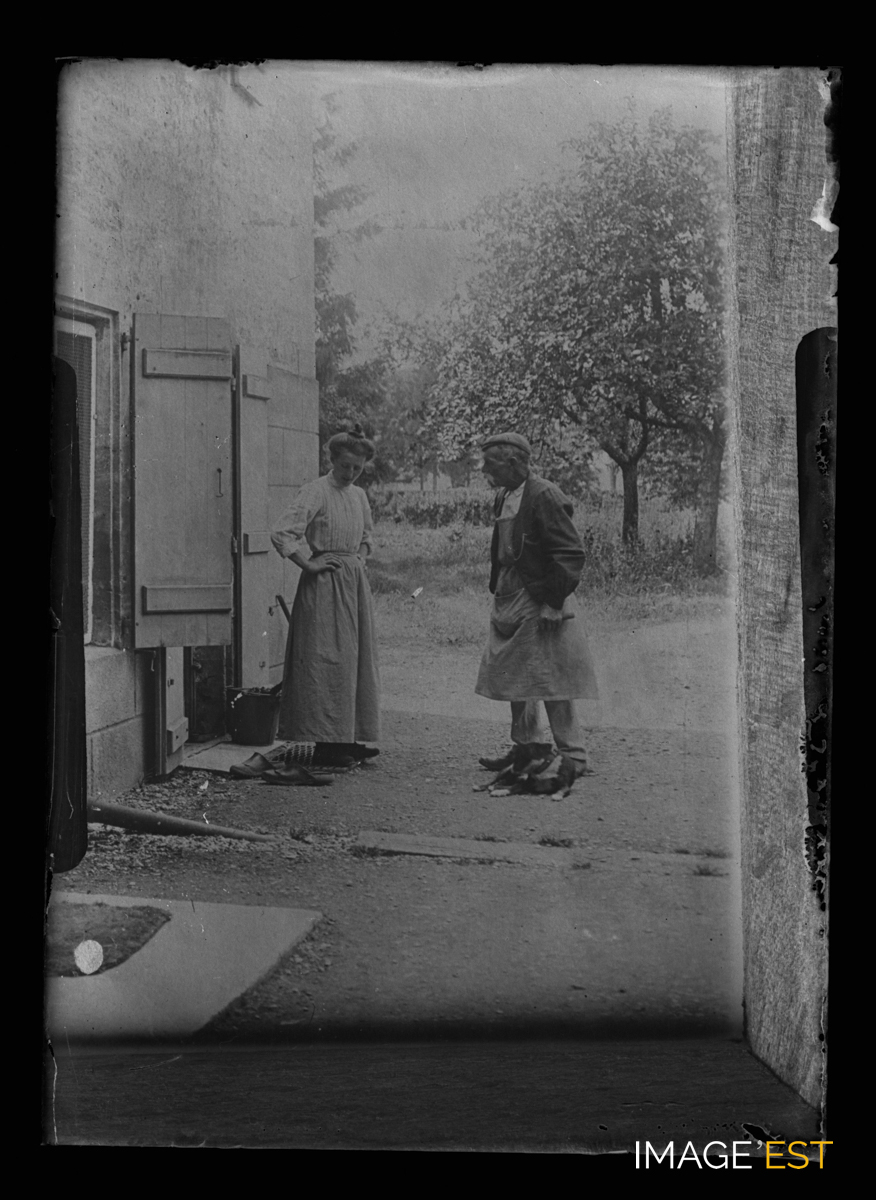 Photographie représentant une femme et un homme dans une rue, probablement à Inor (Meuse). Leurs vêtements ainsi que le cadre rural suggèrent qu'il s'agit de paysans. Un chien se tient aux pieds de l'homme, tandis qu'à l'arrière-plan on observe une végétation abondante, renforçant le caractère campagnard de la scène.