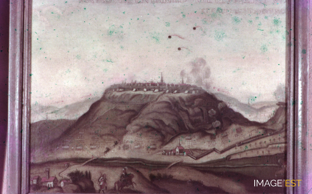 La Lorraine et la guerre de Trente ans. Représentation du second siège de La Mothe en 1645. En marge de la diapositive figure la mention : " 5. Second siège du château de La Mothe (1645) ". Séries de diapositives sélectionnées et commentées par Jean Hurstel, directeur du Service éducatif des Musées de l'Académie de Nancy-Metz.