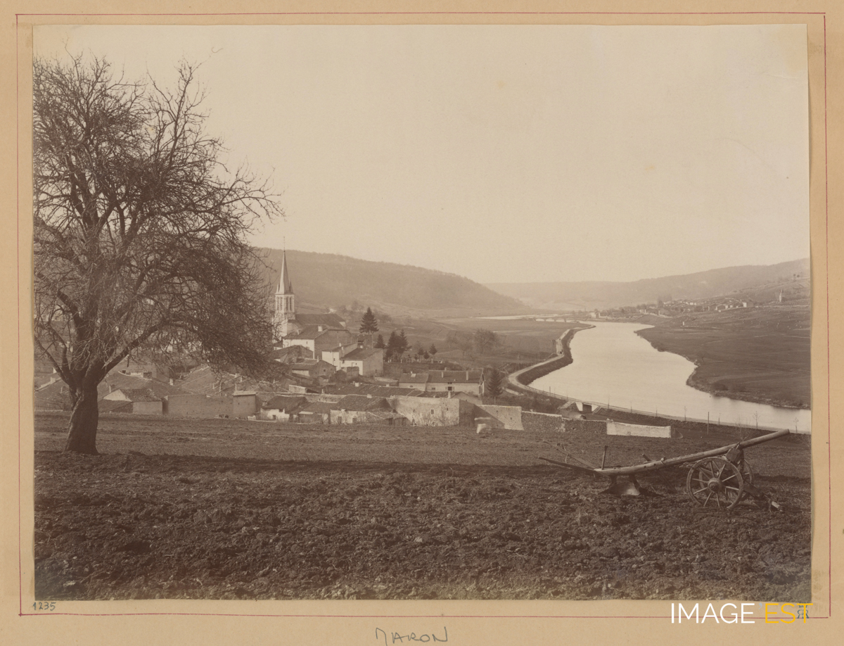 Panorama de Sexey-aux-Forges (Meurthe-et-Moselle) près d'une rive de la Moselle. Au premier plan, une charue. À l'arrière-plan, l'église Saint-Mansuy. En marge de la photographie figurent un numéro " 1235 ", le nom d'une commune " Maron " et un monogramme à l'encre bleue représentant deux " R " accolés (dont un en miroir) surmontés d'une couronne. Cette photographie pourrait être attribuée au photographe professionnel Félix Roy (1862-1930), membre du Photo-Club nancéien et de la Société lorraine de photographie dès 1896, actif de 1897 à 1920 environ.