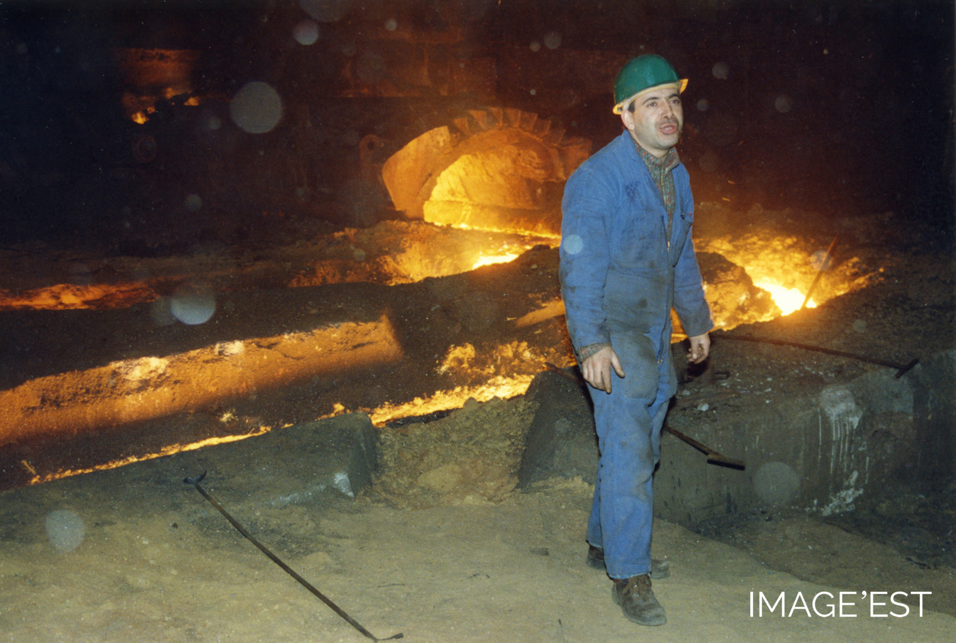 Michel Pellerin, électricien, devant la coulée du haut-fourneau U1 de l'unsine Lorfonte de Uckange (Moselle) le 16 décembre 1991.