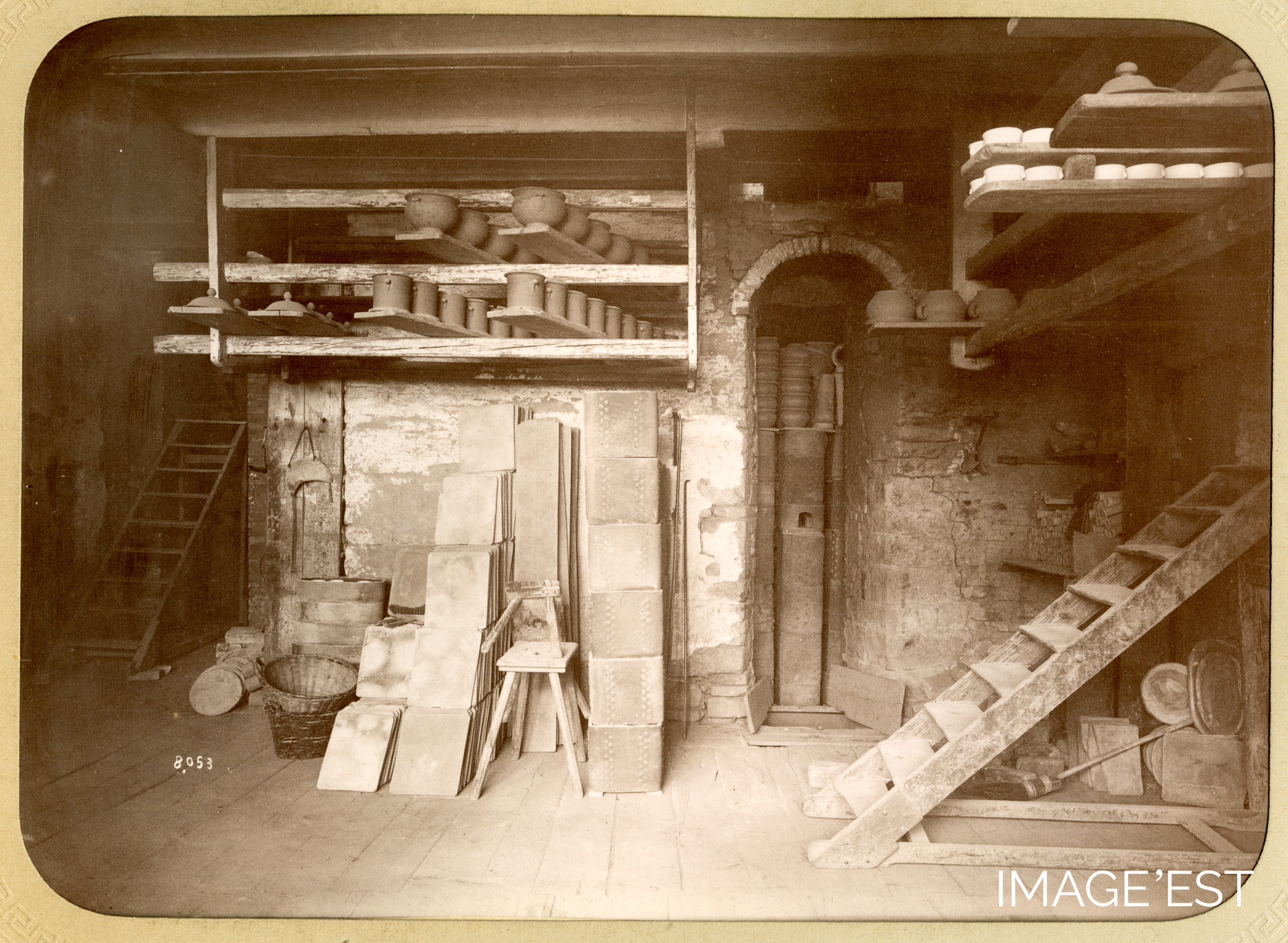 Atelier de séchage de la faïencerie de Lunéville (Meurthe-et-Moselle). Cette photographie, portant le numéro 8.053, est extraite d'album photographique (dérelié) comprenant des clichés des faïenceries de Lunéville et de Saint-Clément pris par les frères Francis (1864-1928) et Édouard (1864-1928) de Jongh en 1893.