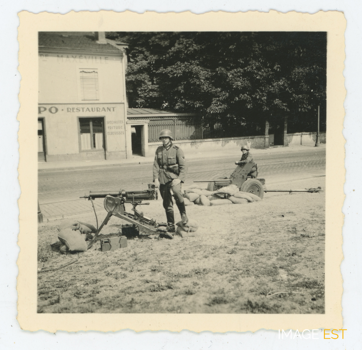Deux soldats allemands, en position de de?fense, Route de Metz, à Maxéville (Meurthe-et-Moselle) devant chez Tempo (futur Trianon) au début de la Seconde Guerre mondiale. Selon l'insigne sur la manche du soldat au premier plan, il s'agirait d'un caporal. Il est debout aupre?s d'une mitrailleuse MG 08 (6073). À l'arrie?re-plan, un simple soldat pre?s d'un canon antichar PAK 36, cale? par des sacs de sable. À noter les rails du tramway de la ligne n°1 et le feuillage des arbres qui pourrait dater le document de la période juin-juillet ; nous sommes donc au tout de?but de l'Occupation. La ville de Nancy est occupée par la 71e et la 258e divisions d'infanterie.