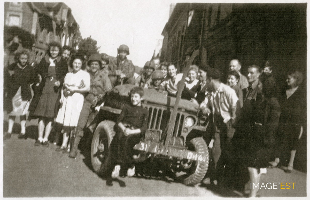 Soldats américains photographiés en présence de la foule lors de la Libération de Pont-à-Mousson (Meurthe-et-Moselle) en septembre 1944.