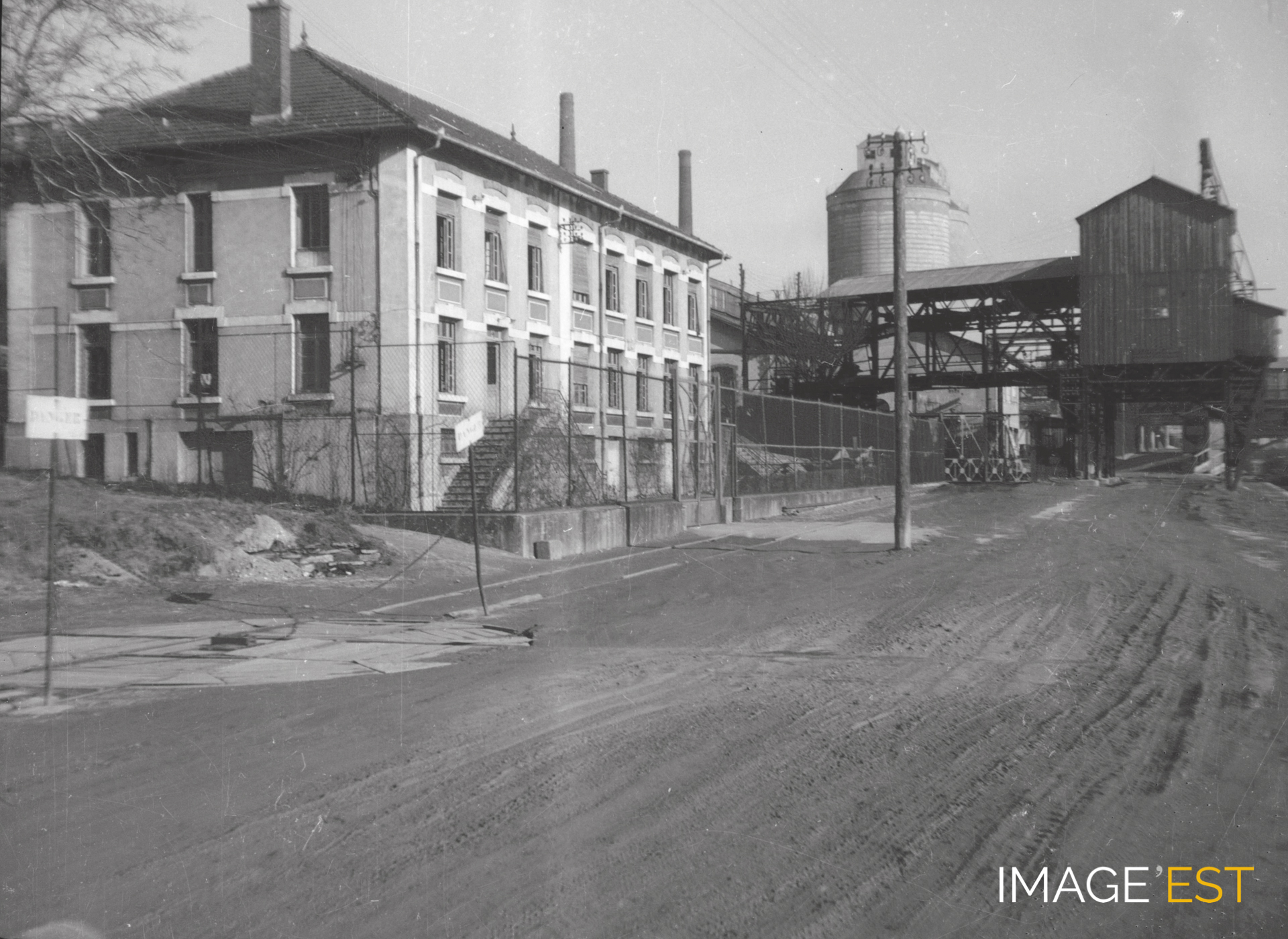 Entrée principale, bureaux, port et transporteur de soude de la Soudière la Meurthe à Varangéville (Meurthe-et-Moselle) en février 1950.