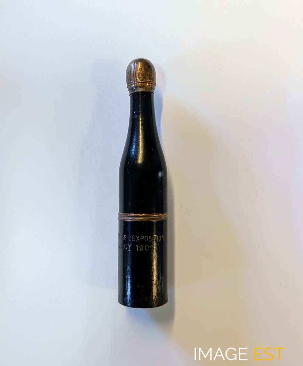 Pipe en forme de petite bouteille portant l'inscription " Souvenir de l'Exposition de Nancy 1909 ". D'une hauteur de 14 cm, cet objet se dévisse dans sa partie inférieure en deux parties pour former une pipe à tabac.