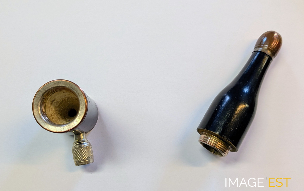 Pipe en forme de petite bouteille portant l'inscription " Souvenir de l'Exposition de Nancy 1909 ". D'une hauteur de 14 cm, cet objet se dévisse dans sa partie inférieure en deux parties pour former une pipe à tabac.
