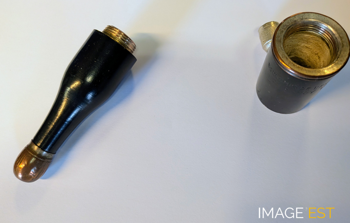 Pipe en forme de petite bouteille portant l'inscription " Souvenir de l'Exposition de Nancy 1909 ". D'une hauteur de 14 cm, cet objet se dévisse dans sa partie inférieure en deux parties pour former une pipe à tabac.