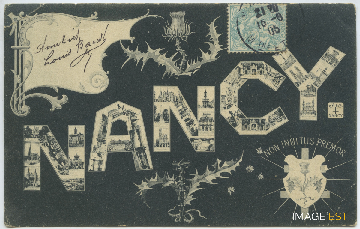 Les lettres de Nancy sont illustrées des principaux monuments de la ville de Nancy (Meurthe-et-Moselle) entourées de chardons et de la célèbre devise " Non inultus premor ".