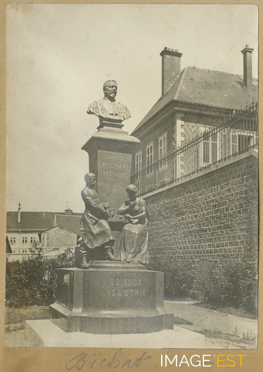 Statue de Ernest Bichat (1845-1905), doyen de la Faculté des Sciences et fondateur de l'Institut d'Électrotechnique et de Mécanique en 1900, érigée dans le square de l'Institut de mathématiques et de physique, rue de la Craffe à Nancy (Meurthe-et-Moselle). Ce buste en bronze, oeuvre du sculpteur Bussière, faillit disparaître sous le régime de Vichy en 1943. Les deux allégories à la base du monument seront quant à elles détruites.