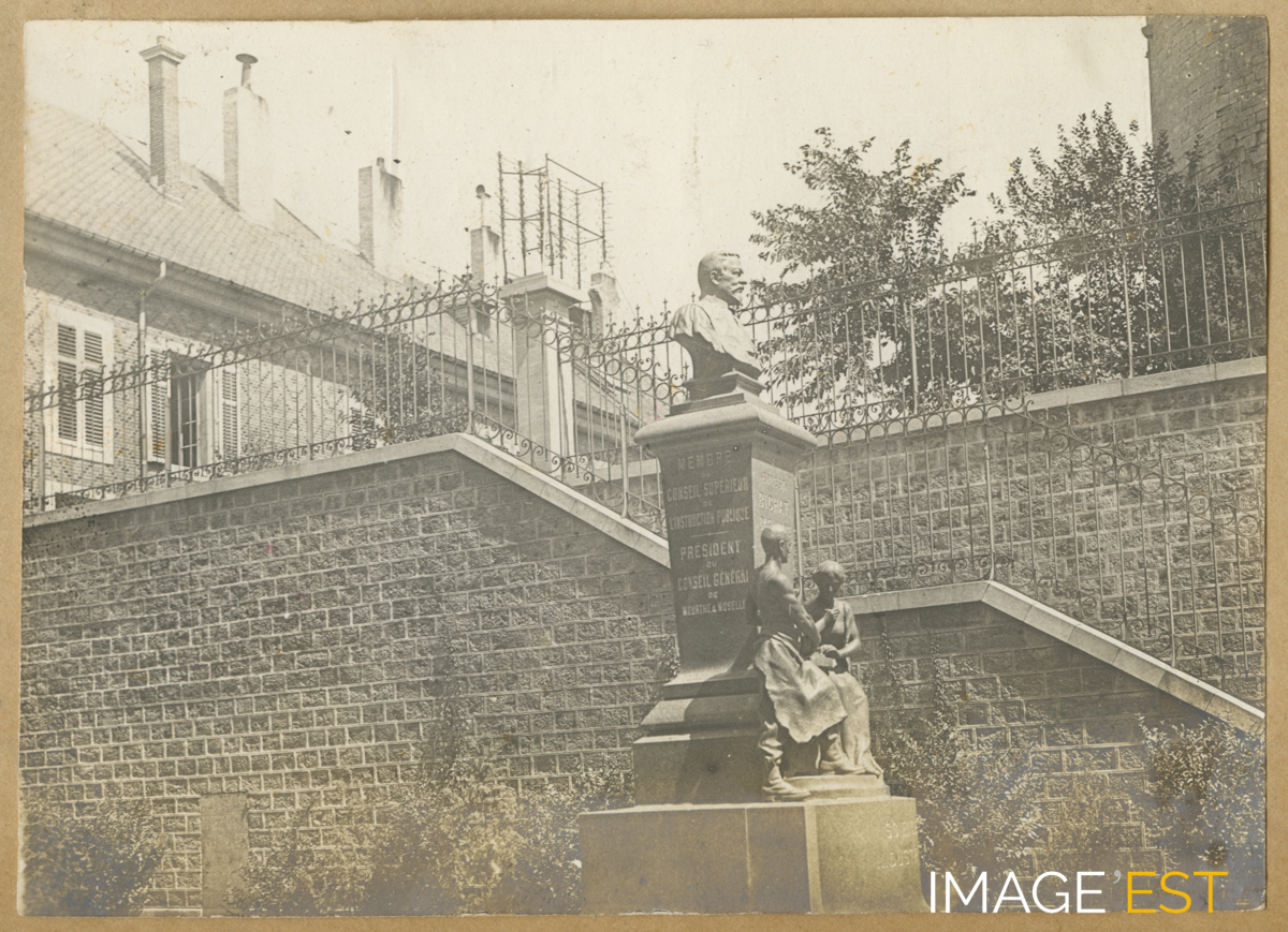 Statue de Ernest Bichat (1845-1905), doyen de la Faculté des Sciences et fondateur de l'Institut d'Électrotechnique et de Mécanique en 1900, érigée dans le square de l'Institut de mathématiques et de physique, rue de la Craffe à Nancy (Meurthe-et-Moselle). Ce buste en bronze, oeuvre du sculpteur Bussière, faillit disparaître sous le régime de Vichy en 1943. Les deux allégories à la base du monument seront quant à elles détruites.