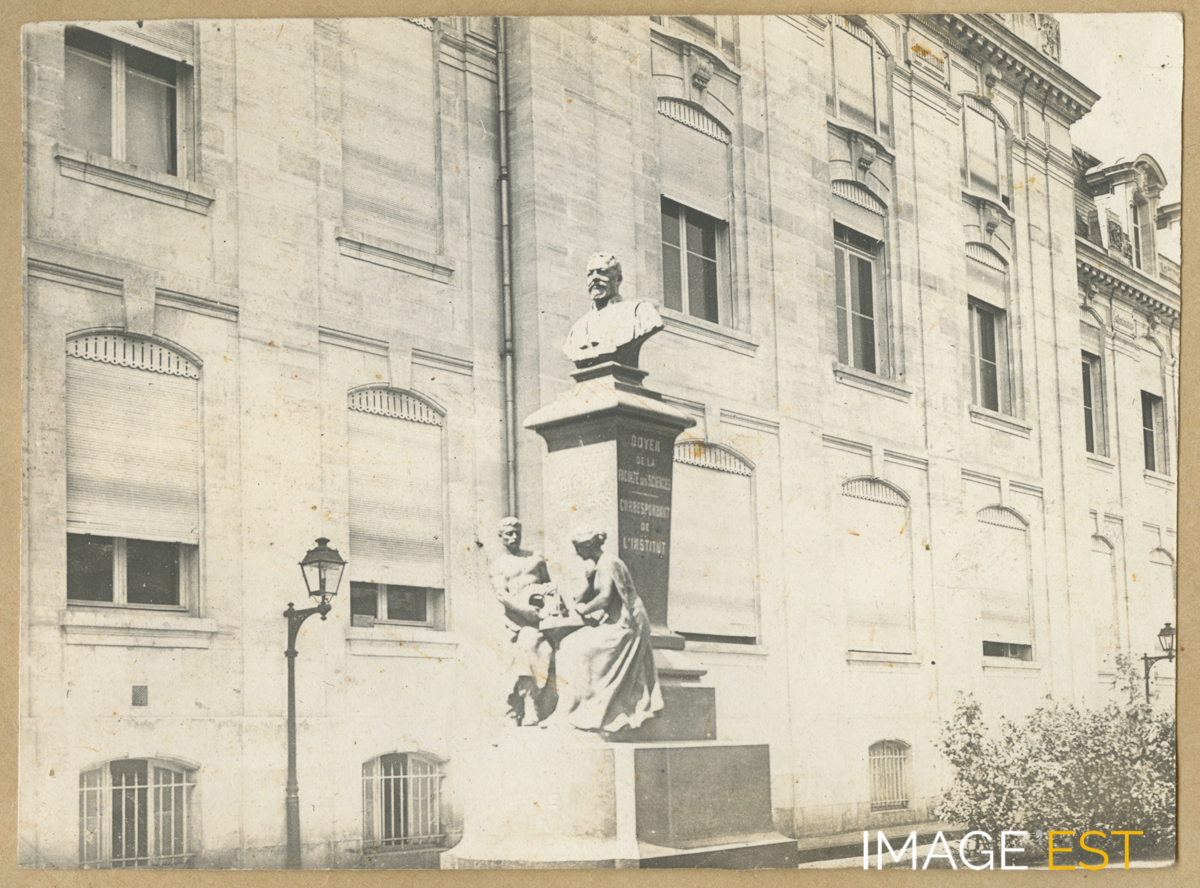 Statue de Ernest Bichat (1845-1905), doyen de la Faculté des Sciences et fondateur de l'Institut d'Électrotechnique et de Mécanique en 1900, érigée dans le square de l'Institut de mathématiques et de physique, rue de la Craffe à Nancy (Meurthe-et-Moselle). Ce buste en bronze, oeuvre du sculpteur Bussière, faillit disparaître sous le régime de Vichy en 1943. Les deux allégories à la base du monument seront quant à elles détruites.