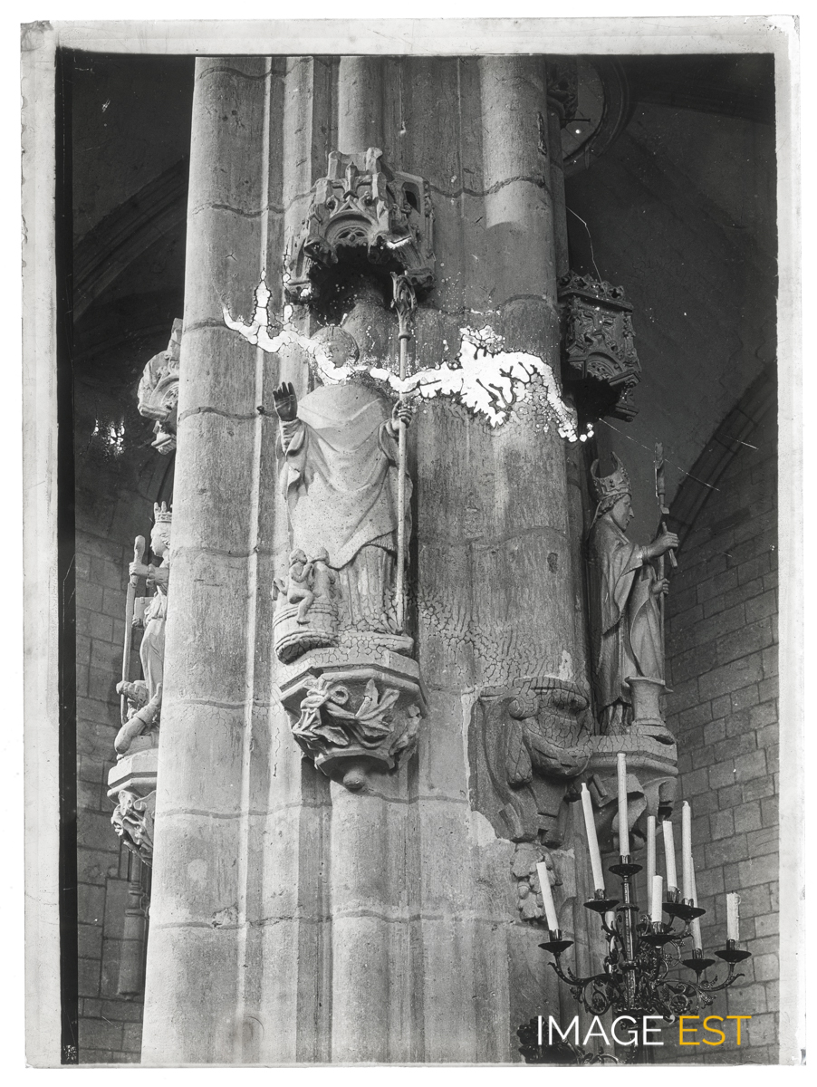 Quatre statues du XVIe siècle (saint Nicolas, saint Éloi, sainte Marthe, saint Laurent) ornant une colonne de droite de la nef de l'église d'Attigny (Ardennes). Ces ½uvres ont été détruites durant la Première Guerre mondiale en 1918. On remarquera aisément au centre saint Nicolas et les trois petits enfants ressuscités du saloir. (Source : https://www.pop.culture.gouv.fr)