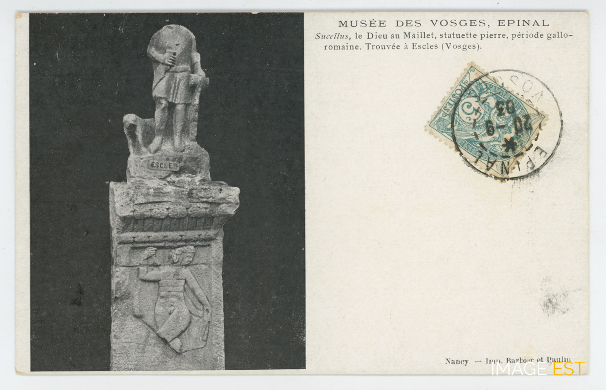 Statuette en pierre sur un socle retrouvée à Escles (Vosges) et déposée au Musée des Vosges à Épinal. Il s'agit de Sucellus, le Dieu au Maillet, statuette pierre, période gallo-romaine.