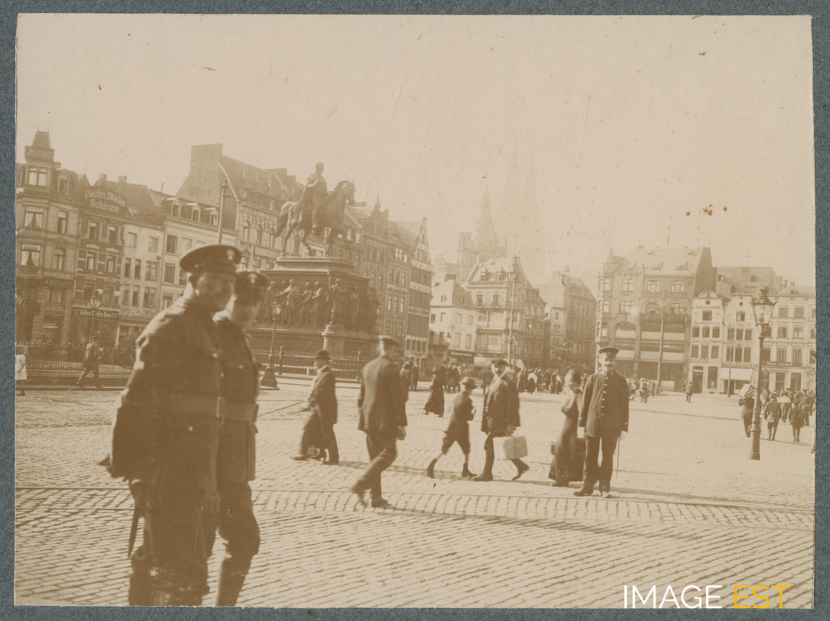 Sur une place près de la cathédrale à Cologne (Allemagne) le 28 mai 1919. Photographie extraite d'un album (format à l'italienne 40 x 31 cm), intitulé : " 1914 - 1919 " et ayant appartenu à M. Henri Boiget, militaire de la 47e compagnie automobile d'aérostation d'observation au cours de la Première Guerre mondiale. Cette compagnie de ballons et cerfs-volants a été créé à Saint-Cyr-l'École (Yvelines) le 8 août 1915 par dédoublement de la 30e compagnie, sous la forme d'un train de combat automobile selon les préconisations du commandant Jacques Théodore Saconney (1874-1935). Elle sera dissoute le 24 février 1919. Une mention manuscrite en marge précise : " Cologne - 28 mai 1919 ".