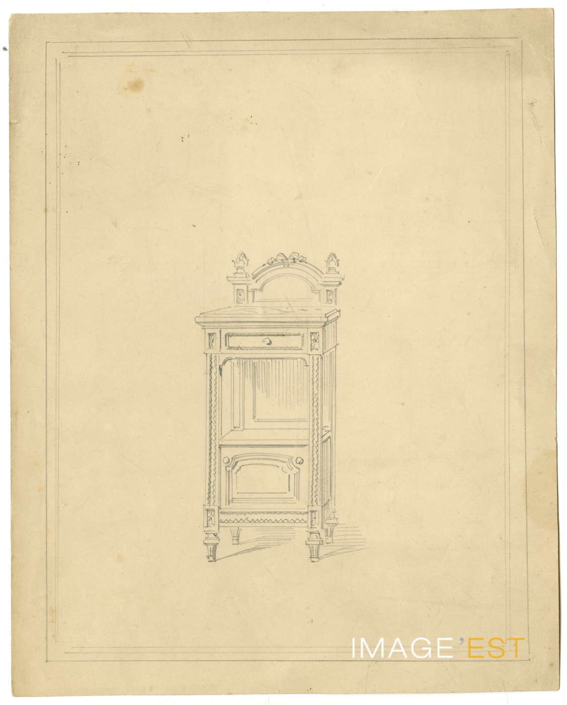 Dessin préparatoire d'une table de chevet réalisé au crayon par Justin Férez (1870-1920), ébéniste d'art, qui travailla pour Eugène Vallin (1856-1922), sculpteur-ébéniste et l'un des vice-présidents de l'École de Nancy dès 1901.